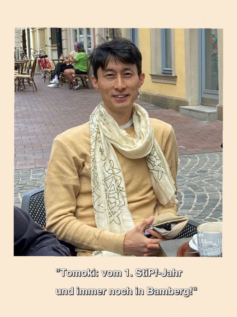 Tomoki gehört zur ersten StiPf-Generation, war also 2012/13 Student in Bamberg, als das StiPf-Programm ins Leben gerufen wurde. Nach seinem Abschluss in Physik in Japan entschied er sich dafür, an der Universität Bamberg Pädagogik mit dem Nebenfach Philosophie zu studieren. Anschließend setzte er seine akademische Laufbahn fort und widmete sich von 2017 bis 2022 intensiv seiner Promotionsarbeit. Gegenwärtig ist er als Dozent am Lehrstuhl für Philosophie II tätig und unterrichtet als Lehrbeauftragter Japanisch am Sprachenzentrum. Besonders erfreulich ist, dass er weiterhin engen Kontakt mit seiner Patenfamilie hat und sie regelmäßig trifft. Wir haben Tomoki gefragt, ob er Bamberg je als langweilig empfunden hat. “Gar nicht” sagt er und verweist auf die vielen unterschiedlichen Angebote und Aktivitäten, die Bamberg bietet. Sein Fazit: Das StiPf-Programm ist sehr hilfreich und er kann es den ausländischen Studierenden nur empfehlen!